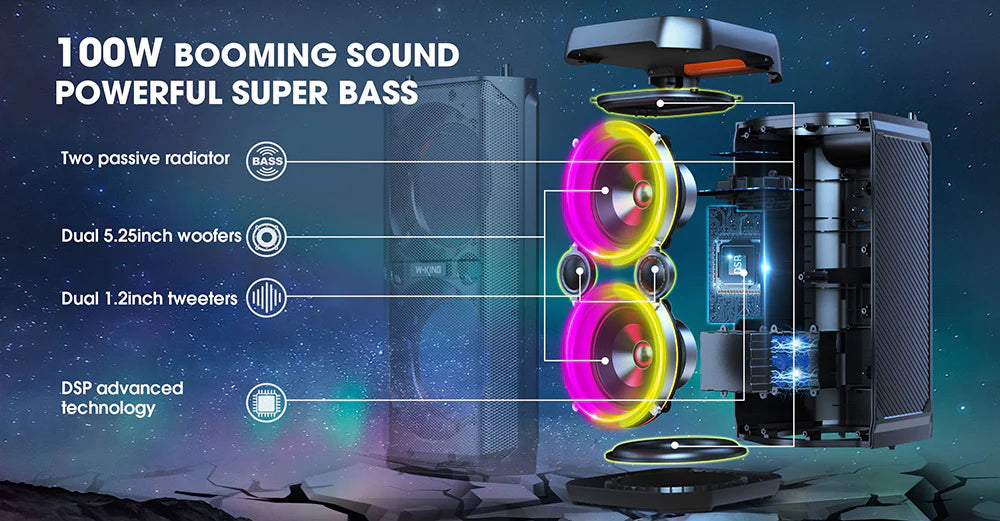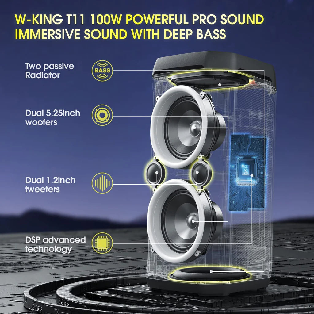 Der W-King T11 ist ein leistungsstarker und tragbarer Bluetooth-Lautsprecher, der überall hervorragende Klangqualität bietet. Mit 100 Watt Ausgangsleistung liefert er tiefe Bässe und klaren, satten Klang, der jeden Raum erfüllt – perfekt für Partys, Outdoor-Abenteuer oder zum Hören in Innenräumen.